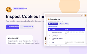 Cookie Parser, Chrome tarayıcısı için geliştirilmiş ücretsiz bir eklentidir. Bu araç, ziyaret ettiğiniz web sitelerindeki çerezleri kolayca incelemenizi sağlar. Aktif sayfada çerez adlarını ve değerlerini düzenli bir tablo formatında görüntüleyebilir, ayrıca tek tıklama ile tüm çerezleri JSON formatında kopyalayabilirsiniz. Geliştiriciler, test uzmanları ve çerezlere dayanan oturum açma, kişiselleştirme gibi durumları çözümlemek isteyen herkes için oldukça yararlıdır.